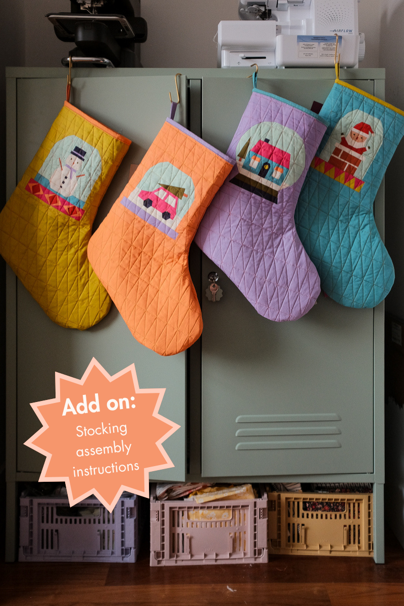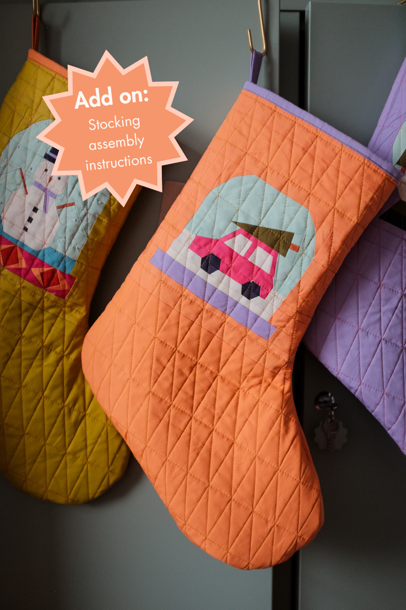 Add on: If a stocking is what you had in mind, we've put together instructions on how to make a stocking 13" x 17" (31cm x 44cm). The instructions in this pattern focuses solely on creating a stocking using completed blocks from the Snowy Scenes Series (Frosted Friend, Holiday Haul, Chimney Cheer and Snowy Stay). The four block patterns are separate from this pattern.