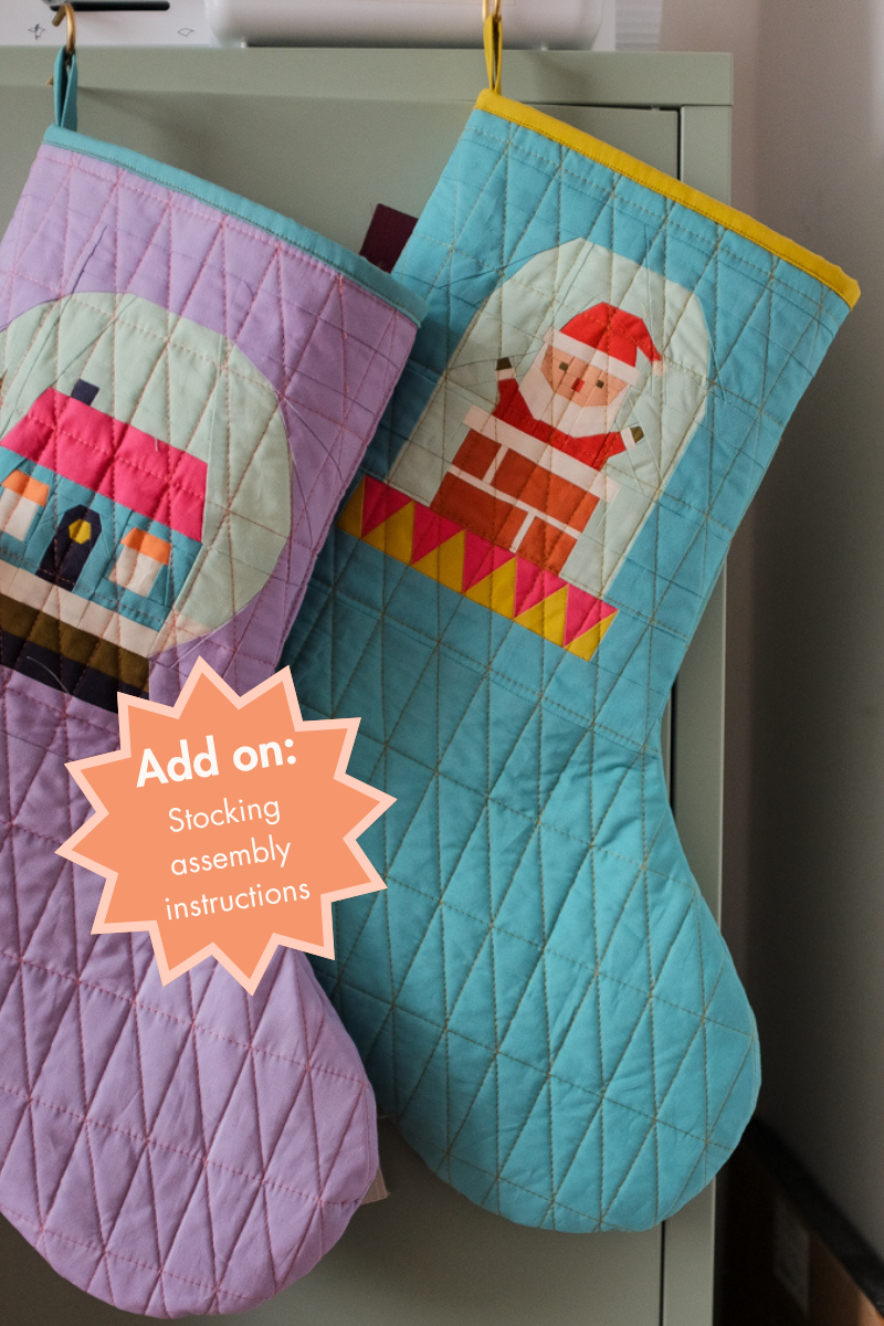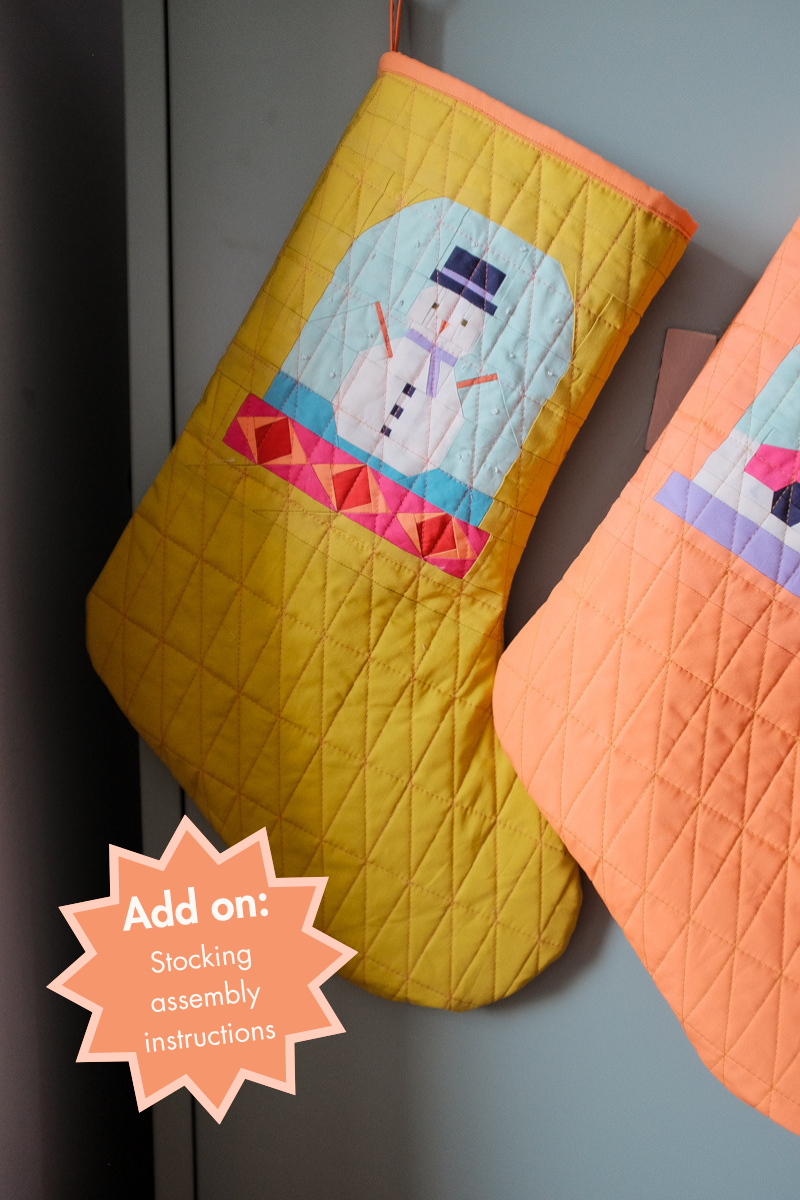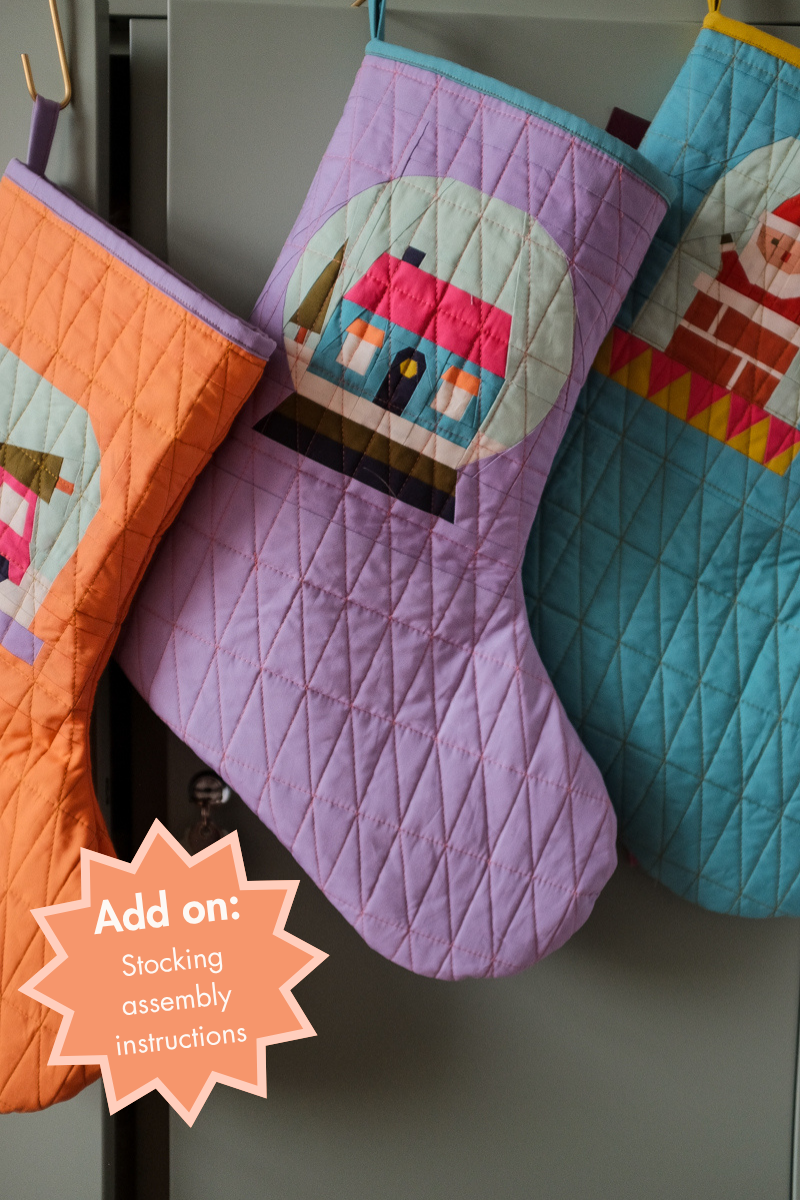 Add on: If a stocking is what you had in mind, we've put together instructions on how to make a stocking 13" x 17" (31cm x 44cm). The instructions in this pattern focuses solely on creating a stocking using completed blocks from the Snowy Scenes Series (Frosted Friend, Holiday Haul, Chimney Cheer and Snowy Stay). The four block patterns are separate from this pattern.